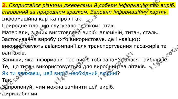 Скористайся різними джерелами й добери інформацію про виріб, створений за природним зразком. Заповни інформаційну картку. Інформаційна картка про літак. Природне тіло, що слугувало зразком: птах. Матеріали, з яких виготовлено виріб: алюміній, титан, сталь. Застосування виробу (хто використовує, де і навіщо): використовують авіакомпанії для транспортування пасажирів та вантажів. Запиши, яка інформація про виріб тобі запам’яталася найбільше. Те, що титан використовується для виробництва літаків. Як ти вважаєш, цей виріб необхідний людині? Так. Запропонуй, чим можна замінити цей виріб. Дирижаблями.