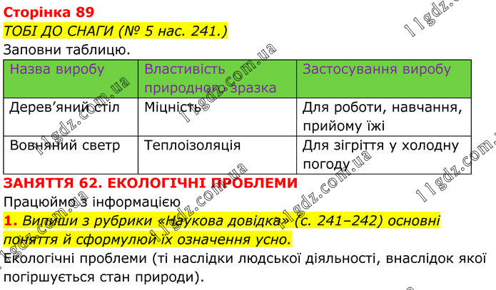 ТОБІ ДО СНАГИ (№ 5 нас. 241.) Заповни таблицю. ЗАНЯТТЯ 62. ЕКОЛОГІЧНІ ПРОБЛЕМИ Працюймо з інформацією 1. Випиши з рубрики «Наукова довідка» (с. 241–242) основні поняття й сформулюй їх означення усно. Екологічні проблеми (ті наслідки людської діяльності, внаслідок якої погіршується стан природи).