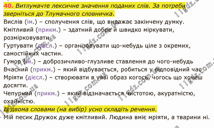 Витлумачте лексичне значення поданих слів. За потреби зверніться до Тлумачного словничка. Вислів (ім.) – сполучення слів, що виражає закінчену думку. Кмітливий (прикм.) – здатний добре й швидко міркувати, розмірковувати. Гуртувати (дієсл.) – організовувати що-небудь ціле з окремих, самостійних частин. Гумор (ім.) – доброзичливо-глузливе ставлення до чого-небудь Вчасний (прикм.) – який відбувається, робиться у відповідний час Мріяти (дієсл.) – створювати в уяві образ когось, чогось що хочеш досягти. Чепурний (прикм.) – який відзначається чистотою, акуратністю, охайністю. Із двома словами (на вибір) усно складіть речення. Мій песик Дружок дуже кмітливий. Людина вміє мріяти, а тварини ні.