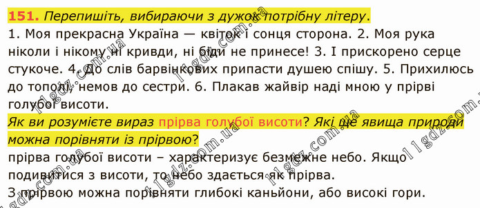 Перепишіть, вибираючи з дужок потрібну літеру. 1. Моя прекрасна Україна — квіток і сонця сторона. 2. Моя рука ніколи і нікому ні кривди, ні біди не принесе! 3. І прискорено серце стукоче. 4. До слів барвінкових припасти душею спішу. 5. Прихилюсь до тополі, немов до сестри. 6. Плакав жайвір наді мною у прірві голубої висоти. Як ви розумієте вираз прірва голубої висоти? Які ще явища природи можна порівняти із прірвою? прірва голубої висоти – характеризує безмежне небо. Якщо подивитися з висоти, то небо здається як прірва. З прірвою можна порівняти глибокі каньйони, або високі гори.