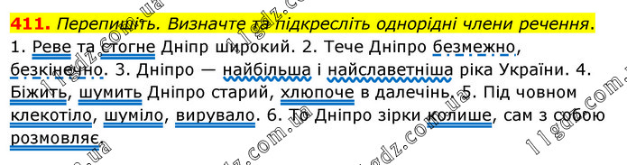 Перепишіть. Визначте та підкресліть однорідні члени речення. 1. Реве та стогне Дніпр широкий. 2. Тече Дніпро безмежно, безкінечно. 3. Дніпро — найбільша і найславетніша ріка України. 4. Біжить, шумить Дніпро старий, хлюпоче в далечінь. 5. Під човном клекотіло, шуміло, вирувало. 6. То Дніпро зірки колише, сам з собою розмовляє.