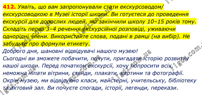 Уявіть, що вам запропонували стати екскурсоводом/ екскурсоводкою в Музеї історії школи. Ви готуєтеся до проведення екскурсії для дорослих людей, які закінчили школу 10–15 років тому. Складіть перші 3–4 речення екскурсійної розповіді, уживаючи однорідні члени. Використайте слова, подані в рамці (на вибір). Не забудьте про формули етикету. Доброго дня, шановні відвідувачі нашого музею! Сьогодні ви зможете побачити, почути, пригадати історію розвитку нашої школи. Перед початком екскурсії, хочу попросити всіх, неможна чіпати вітрини, стенди, плакати, картини та фотографії. Окрім музею, ми відвідуємо класи, майстерні, учительську, бібліотеку та актовий зал. Ви почуєте спогади, історії, легенди, перекази.