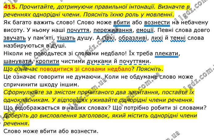 Прочитайте, дотримуючи правильної інтонації. Визначте в реченнях однорідні члени. Поясніть їхню роль у мовленні. Як багато важить слово! Слово може вбити або вознести на небачену висоту. У ньому наші почуття, переживання, емоції. Певні слова довго звучать у пам’яті, тішать душу. А гіркі, образливі, лихі й темні слова назбируються в душі. Ніколи не поводьтеся зі словами недбало! Їх треба плекати, шанувати, кропити чистими думками й почуттями. Що означає поводитися зі словами недбало? Поясніть. Це означає говорити не думаючи. Коли не обдумане слово може спричинити шкоду іншим. Сформулюйте за змістом прочитаного два запитання, поставте їх однокласникам. У відповідях уживайте однорідні члени речення. Що відображається в наших словах? Що потрібно робити зі словами? Доберіть до висловлення заголовок, який містить однорідні члени речення. Слово може вбити або вознести.