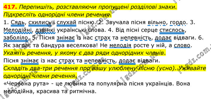 Перепишіть, розставляючи пропущені розділові знаки. Підкресліть однорідні члени речення. 1. Сядь, схились і слухай пісню. 2. Звучала пісня вільно, гордо. 3. Мелодійні, дзвінкі українські слова. 4. Від пісні серце стислось, заболіло. 5. Пісня знімає із нас страх та непевність, додає відваги. 6. Як заграє та бандура веселкова! Не мелодія росте у ній, а слово. Укажіть речення, у якому є два ряди однорідних членів. Пісня знімає із нас страх та непевність, додає відваги. Складіть два-три речення про вашу улюблену пісню (усно). Уживайте однорідні члени речення. «Червона рута» - це любима та популярна пісня українців. Вона мелодійна, красива та ритмічна.