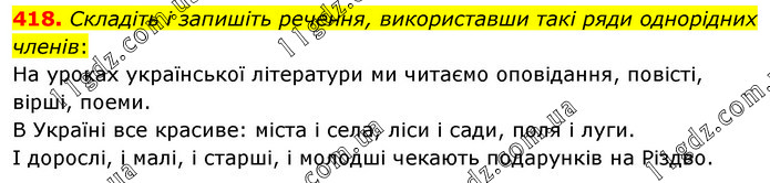 Складіть і запишіть речення, використавши такі ряди однорідних членів: На уроках української літератури ми читаємо оповідання, повісті, вірші, поеми. В Україні все красиве: міста і села, ліси і сади, поля і луги. І дорослі, і малі, і старші, і молодші чекають подарунків на Різдво.