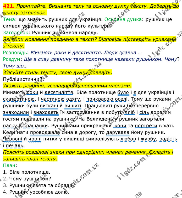 Прочитайте. Визначте тему та основну думку тексту. Доберіть до тексту заголовок. Тема: що значить рушник для українця. Основна думка: рушник це символ українського народу його культури. Заголовок: Рушник як символ народу. Які типи мовлення поєднано в тексті? Відповідь підтвердіть уривками з тексту. Розповідь: Минають роки й десятиліття. Люди здавна … Роздум: Ще в сиву давнину таке полотнище назвали рушником. Чому? Тому що… З’ясуйте стиль тексту, свою думку доведіть. Публіцистичний. Укажіть речення, ускладнені однорідними членами. Минають роки й десятиліття. Біле полотнище було і є для українців і скатертиною, і частиною одягу, і прикрасою оселі. Тому що руками рушники були виткані й вишиті. Працьовиті руки безперервно знаходили і знаходять їм застосування в побуті. Хліб і сіль дорогим гостям подавали на рушнику. На Великдень у рушник загортали паску й крашанки. Рушниками прикрашали ікони та портрети в хаті. Коли мати проводжала сина в дорогу, то дарувала йому рушник. Червоні й чорні нитки у вишивці символізують любов і журбу, радість і печаль. Поясніть розділові знаки при однорідних членах речення. Складіть і запишіть план тексту. План: 1. Біле полотнище. 2. Чому рушником? 3. Рушники свята та обряди. 4. Рушник уособлює долю.