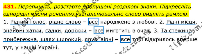 Перепишіть, розставте пропущені розділові знаки. Підкресліть однорідні члени речення, узагальнювальне слово виділіть рамкою. 1. Рідний голос, рідне слово – все народжене з любові. 2. Рідні місця, знайомі хатки, садки, доріжки – все миготить в очах. 3. Та стежина прибережна, шлях широкий, друзі вірні – все тобі відкрилось вперше тут, у нашій Україні.