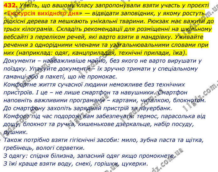 Уявіть, що вашому класу запропонували взяти участь у проєкті «Екскурсія вихідного дня» — відвідати заповідник, у якому ростуть рідкісні дерева та мешкають унікальні тварини. Рюкзак має важити до трьох кілограмів. Складіть рекомендації для розміщенні на шкільному вебсайті з переліком речей, які варто взяти в мандрівку. Уживайте речення з однорідними членами та узагальнювальними словами при них (наприклад: одяг, канцприладдя, технічні прилади, їжа). Документи – найважливіше майно, без якого не варто вирушати у поїздку. Упакуйте документи – їх зручно тримати у спеціальному гаманці або в пакеті, що не промокає. Комфортне життя сучасної людини неможливе без технічних пристроїв. І це – не лише смартфон та навушники. Смартфон наповніть важливими програмами – картами, читалкою, блокнотом. До смартфону захопіть зарядний пристрій та пауербанк. Комфорт під час подорожі вам забезпечать: термос, парасолька від дощу, блокнот та ручка, кишенькове дзеркальце, набір посуду, рушник. Також потрібно взяти гігієнічні засоби: мило, зубна паста та щітка, гребінець, вологі серветки. З одягу: спідня білизна, запасний одяг якщо промокнете. З їжі краще взяти воду, снекі, горішки, цукерки.