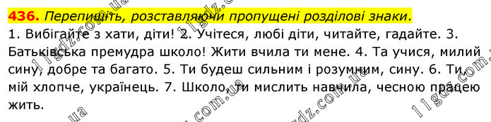 Перепишіть, розставляючи пропущені розділові знаки. 1. Вибігайте з хати, діти! 2. Учітеся, любі діти, читайте, гадайте. 3. Батьківська премудра школо! Жити вчила ти мене. 4. Та учися, милий сину, добре та багато. 5. Ти будеш сильним і розумним, сину. 6. Ти, мій хлопче, українець. 7. Школо, ти мислить навчила, чесною працею жить.