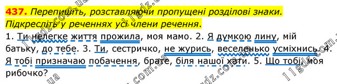 Перепишіть, розставляючи пропущені розділові знаки. Підкресліть у реченнях усі члени речення. 1. Ти нелегке життя прожила, моя мамо. 2. Я думкою лину, мій батьку, до тебе. 3. Ти, сестричко, не журись, веселенько усміхнись. 4. Я тобі призначаю побачення, брате, біля нашої хати. 5. Що тобі, моя рибочко?