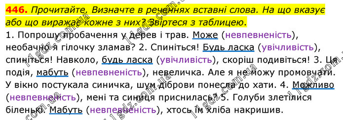 Прочитайте. Визначте в реченнях вставні слова. На що вказує або що виражає кожне з них? Звіртеся з таблицею. 1. Попрошу пробачення у дерев і трав. Може (невпевненість), необачно я гілочку зламав? 2. Спиніться! Будь ласка (увічливість), спиніться! Навколо, будь ласка (увічливість), скоріш подивіться! 3. Ця подія, мабуть (невпевненість), невеличка. Але я не можу промовчати. У вікно постукала синичка, шум діброви понесла до хати. 4. Можливо (невпевненість), мені та синиця приснилась? 5. Голуби злетілися біленькі. Мабуть (невпевненість), хтось їм хліба накришив.