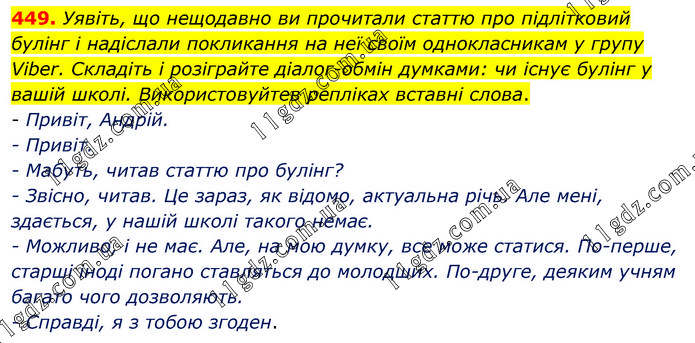 Уявіть, що нещодавно ви прочитали статтю про підлітковий булінг і надіслали покликання на неї своїм однокласникам у групу Viber. Складіть і розіграйте діалог-обмін думками: чи існує булінг у вашій школі. Використовуйтев репліках вставні слова. - Привіт, Андрій. - Привіт. - Мабуть, читав статтю про булінг? - Звісно, читав. Це зараз, як відомо, актуальна річь. Але мені, здається, у нашій школі такого немає. - Можливо, і не має. Але, на мою думку, все може статися. По-перше, старші іноді погано ставляться до молодших. По-друге, деяким учням багато чого дозволяють. - Справді, я з тобою згоден.