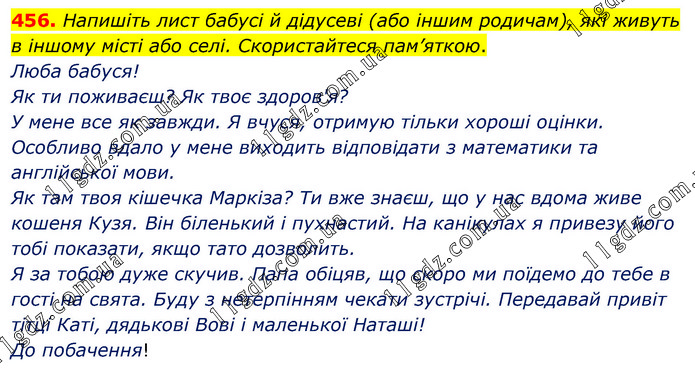 Напишіть лист бабусі й дідусеві (або іншим родичам), які живуть в іншому місті або селі. Скористайтеся пам’яткою. Люба бабуся! Як ти поживаєш? Як твоє здоров'я? У мене все як завжди. Я вчуся, отримую тільки хороші оцінки. Особливо вдало у мене виходить відповідати з математики та англійської мови. Як там твоя кішечка Маркіза? Ти вже знаєш, що у нас вдома живе кошеня Кузя. Він біленький і пухнастий. На канікулах я привезу його тобі показати, якщо тато дозволить. Я за тобою дуже скучив. Папа обіцяв, що скоро ми поїдемо до тебе в гості на свята. Буду з нетерпінням чекати зустрічі. Передавай привіт тітці Каті, дядькові Вові і маленької Наташі! До побачення!