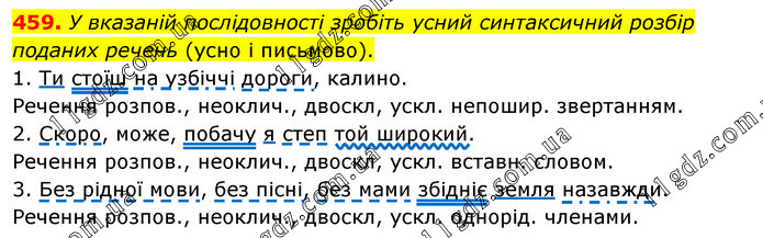 У вказаній послідовності зробіть усний синтаксичний розбір поданих речень (усно і письмово). 1. Ти стоїш на узбіччі дороги, калино. Речення розпов., неоклич., двоскл, ускл. непошир. звертанням. 2. Скоро, може, побачу я степ той широкий. Речення розпов., неоклич., двоскл, ускл. вставн. словом. 3. Без рідної мови, без пісні, без мами збідніє земля назавжди. Речення розпов., неоклич., двоскл, ускл. однорід. членами.