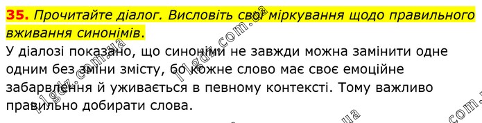 Прочитайте діалог. Висловіть свої міркування щодо правильного вживання синонімів. У діалозі показано, що синоніми не завжди можна замінити одне одним без зміни змісту, бо кожне слово має своє емоційне забарвлення й уживається в певному контексті. Тому важливо правильно добирати слова.