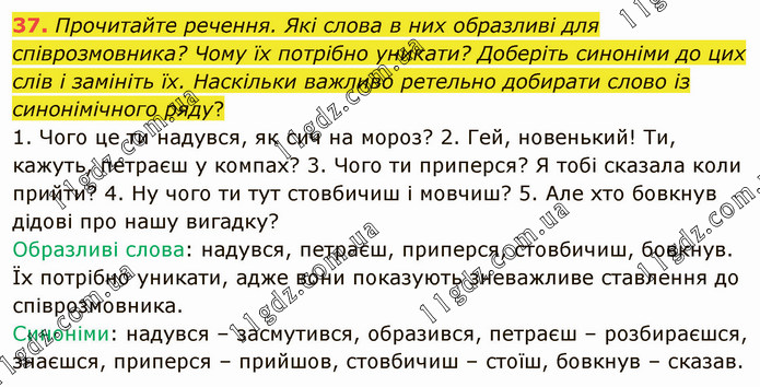 Прочитайте речення. Які слова в них образливі для співрозмовника? Чому їх потрібно уникати? Доберіть синоніми до цих слів і замініть їх. Наскільки важливо ретельно добирати слово із синонімічного ряду? 1. Чого це ти надувся, як сич на мороз? 2. Гей, новенький! Ти, кажуть, петраєш у компах? 3. Чого ти приперся? Я тобі сказала коли прийти? 4. Ну чого ти тут стовбичиш і мовчиш? 5. Але хто бовкнув дідові про нашу вигадку? Образливі слова: надувся, петраєш, приперся, стовбичиш, бовкнув. Їх потрібно уникати, адже вони показують зневажливе ставлення до співрозмовника. Синоніми: надувся – засмутився, образився, петраєш – розбираєшся, знаєшся, приперся – прийшов, стовбичиш – стоїш, бовкнув – сказав.