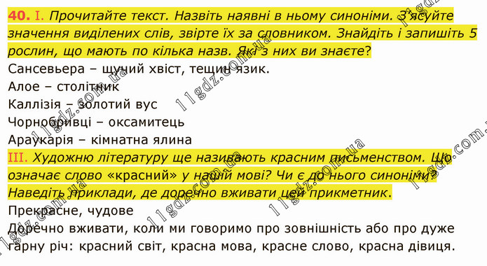 І. Прочитайте текст. Назвіть наявні в ньому синоніми. З’ясуйте значення виділених слів, звірте їх за словником. Знайдіть і запишіть 5 рослин, що мають по кілька назв. Які з них ви знаєте? Сансевьера – щучий хвіст, тещин язик. Алое – столітник Каллізія – золотий вус Чорнобривці – оксамитець Араукарія – кімнатна ялина ІІІ. Художню літературу ще називають красним письменством. Що означає слово «красний» у нашій мові? Чи є до нього синоніми? Наведіть приклади, де доречно вживати цей прикметник. Прекрасне, чудове Доречно вживати, коли ми говоримо про зовнішність або про дуже гарну річ: красний світ, красна мова, красне слово, красна дівиця.