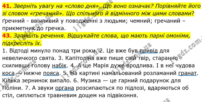 41. Зверніть увагу на «слово дня». Що воно означає? Порівняйте його зі словом «гречаний». Що спільного й відмінного між цими словами? ґречний - ввічливий у поводженні з людьми; чемний; гречаний – прикметник до гречка. 43. Запишіть речення. Відшукайте слова, що мають парні омоніми, підкресліть їх. 1. Відтоді минуло понад три роки. 2. Це вже був привід для невеличкого свята. 3. Капітоліна вже пише свій твір, старанно схиливши голову набік. 4. А ще Марія дуже вродлива. І в неї чудова коса — нижче пояса. 5. На картині намальований розламаний гранат. Кілька зернинок випало. 6. Музика — це гарний подарунок для Поліни. 7. А звуки органа розсипаються по підлозі, вдаряються об стіл, сиплються травневим дощем на підвіконня.