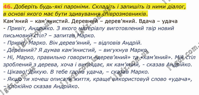 Доберіть будь-які пароніми. Складіть і запишіть із ними діалог, в основі якого має бути здивування співрозмовників. Кам’яний – кам’янистий. Деревний – дерев’яний. Вдача – удача - Привіт, Андрійко. З якого матеріалу виготовлений твір новий письмовий стіл? – запитав Марко. - Привіт, Марко. Він дерев’яний, – відповів Андрій. - Деревний? Я думав кам’янистий, – вигукнув Марко. - Ні, Марко, правильно говорити «дерев’яний» та «кам’яний». Мій стіл зроблений з дерева, хоча і виглядає, як кам’яний, - сказав Андрійко. - Цікаво! Дякую. В тебе гарна удача, – сказав Марко. - Якщо ти хочеш описати життя, краще використовуй слово «удача», – спокійно сказав Андрійко.