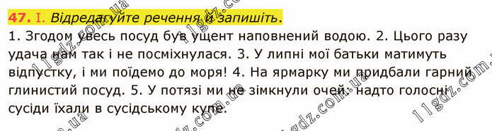 І. Відредагуйте речення й запишіть. 1. Згодом увесь посуд був ущент наповнений водою. 2. Цього разу удача нам так і не посміхнулася. 3. У липні мої батьки матимуть відпустку, і ми поїдемо до моря! 4. На ярмарку ми придбали гарний глинистий посуд. 5. У потязі ми не зімкнули очей: надто голосні сусіди їхали в сусідському купе.