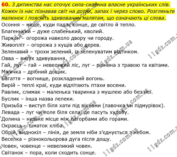 3 дитинства нас оточує сила-силенна власне українських слів. Кожен із нас пізнавав світ на дотик, запах і через слово. Розгляньте малюнок і поясніть здивованим малятам, що означають ці слова. Осоння – місце, куди падає сонце, де світло й тепло. Благенький – дуже слабенький, кволий. Паркан – огорожа навколо двору чи городу. Живопліт – огорожа з кущів або дерев. Зеленавий – трохи зелений, із зеленуватим відтінком. Овва – вигук здивування. Гай, луг – гай – невеликий ліс, луг – рівнина з травою та квітами. Мжичка – дрібний дощик. Багаття – вогнище, розкладений вогонь. Вирій – теплі краї, куди відлітають птахи восени. Равлик, слимак – маленька тваринка з мушлею або без неї. Буслик – інша назва лелеки. Призьба – виступ біля хати під вікнами (лавочка чи підмурівок). Левада – луг чи поле біля села, де пасуть худобу. Долина – низьке місце між пагорбами або горами. Окраєць – шматок хліба. Обрій, виднокіл – лінія, де земля ніби з’єднується з небом. Веселка – різнокольорова дуга після дощу. Човен, човенце – невеликий човен. Світанок – пора, коли сходить сонце.