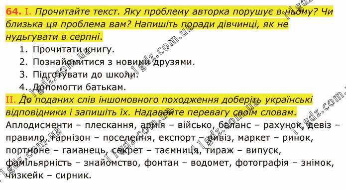 І. Прочитайте текст. Яку проблему авторка порушує в ньому? Чи близька ця проблема вам? Напишіть поради дівчинці, як не нудьгувати в серпні. 1. Прочитати книгу. 2. Познайомитися з новими друзями. 3. Підготувати до школи. 4. Допомогти батькам. ІІ. До поданих слів іншомовного походження доберіть українські відповідники і запишіть їх. Надавайте перевагу своїм словам. Аплодисменти – плескання, армія – військо, баланс – рахунок, девіз – правило, гарнізон – поселення, експорт – вивіз, маркет – ринок, портмоне – гаманець, секрет – таємниця, тираж – випуск, фамільярність – знайомство, фонтан – водомет, фотографія – знімок, чизкейк – сирник.