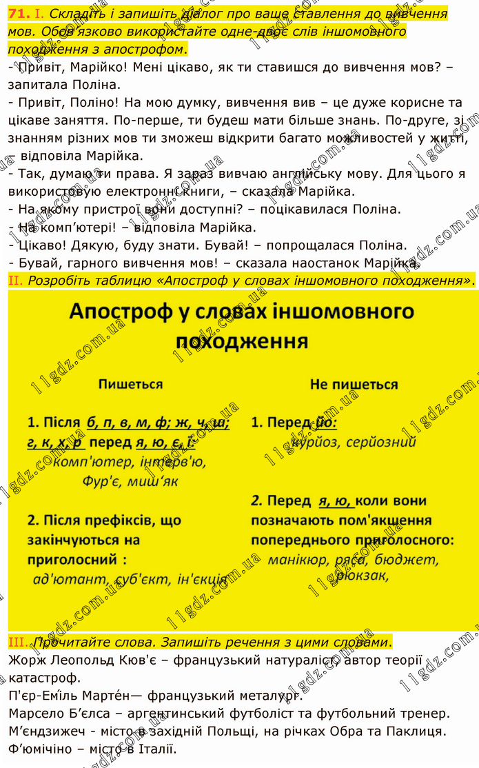 І. Складіть і запишіть діалог про ваше ставлення до вивчення мов. Обов’язково використайте одне-двоє слів іншомовного походження з апострофом. - Привіт, Марійко! Мені цікаво, як ти ставишся до вивчення мов? – запитала Поліна. - Привіт, Поліно! На мою думку, вивчення вив – це дуже корисне та цікаве заняття. По-перше, ти будеш мати більше знань. По-друге, зі знанням різних мов ти зможеш відкрити багато можливостей у житті, – відповіла Марійка. - Так, думаю ти права. Я зараз вивчаю англійську мову. Для цього я використовую електронні книги, – сказала Марійка. - На якому пристрої вони доступні? – поцікавилася Поліна. - На комп’ютері! – відповіла Марійка. - Цікаво! Дякую, буду знати. Бувай! – попрощалася Поліна. - Бувай, гарного вивчення мов! – сказала наостанок Марійка. ІІ. Розробіть таблицю «Апостроф у словах іншомовного походження». ІІІ. Прочитайте слова. Запишіть речення з цими словами. Жорж Леопольд Кюв'є – французький натураліст, автор теорії катастроф. П'єр-Емі́ль Марте́н— французький металург. Марсело Б’єлса – аргентинський футболіст та футбольний тренер. М’єндзижеч - місто в західній Польщі, на річках Обра та Паклиця. Ф’юмічіно – місто в Італії.