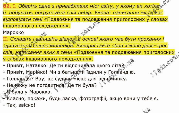 І. Оберіть одне з привабливих міст світу, у якому ви хотіли б побувати, обґрунтуйте свій вибір. Умова: написання міста має відповідати темі «Подвоєння та подовження приголосних у словах іншомовного походження». Марокко ІІ. Складіть і запишіть діалог, в основі якого має бути прохання і здивування співрозмовників. Використайте обов’язково двоє–троє слів, написання яких з теми «Подвоєння та подовження приголосних у словах іншомовного походження». - Привіт, Наталко! Де ти відпочивала цього літа? - Привіт, Марійко! Ми з батьками їздили у Голландію. - Голландія? Вау, це судове місце для відпочинку. - Не можу не погодитися. Де ти була? - Я була у Марокко. - Класно, покажи, будь ласка, фотографії, якщо вони у тебе є. - Так, звісно!