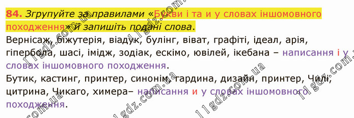 Згрупуйте за правилами «Букви і та и у словах іншомовного походження» й запишіть подані слова. Вернісаж, біжутерія, віадук, булінг, віват, графіті, ідеал, арія, гіпербола, шасі, імідж, зодіак, ескімо, ювілей, ікебана – написання і у словах іншомовного походження. Бутик, кастинг, принтер, синонім, гардина, дизайн, принтер, Чилі, цитрина, Чикаго, химера– написання и у словах іншомовного походження.
