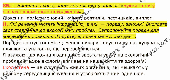 І. Випишіть слова, написання яких відповідає «Букви і та и у словах іншомовного походження». Діоксини, поліетиленовий, клімат, рептилій, пестицидів, диплом ІІ. Які речення містять інформацію, а які — пораду, заклик? Висловте своє ставлення до екологічних проблем. Запропонуйте поради для збереження довкілля. З’ясуйте, що означає «слово дня». Поради: сортувати сміття; менше використовувати папір; купувати пляшки та упаковки, що переробляються. Я вважаю, що кожна людина має звертати увагу на екологічні проблеми, адже екологія впливає на наше життя та здоров’я. Екосистема — це сукупність живих організмів, які мешкають у певному середовищі існування й утворюють з ним одне ціле.