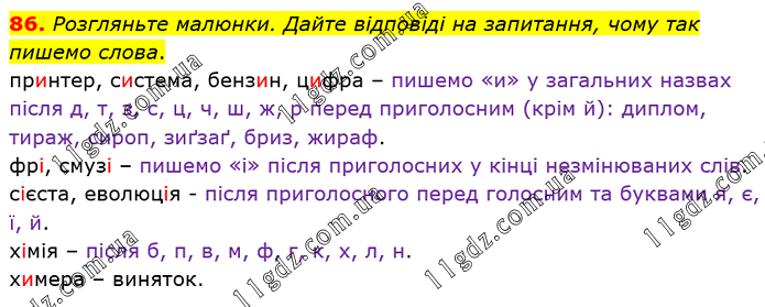 Розгляньте малюнки. Дайте відповіді на запитання, чому так пишемо слова. принтер, система, бензин, цифра – пишемо «и» у загальних назвах після д, т, з, с, ц, ч, ш, ж, р перед приголосним (крім й): диплом, тираж, сироп, зиґзаґ, бриз, жираф. фрі, смузі – пишемо «і» після приголосних у кінці незмінюваних слів. сієста, еволюція - після приголосного перед голосним та буквами я, є, ї, й. хімія – після б, п, в, м, ф, г, к, х, л, н. химера – виняток.