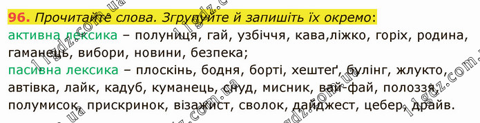 Прочитайте слова. Згрупуйте й запишіть їх окремо: активна лексика – полуниця, гай, узбіччя, кава,ліжко, горіх, родина, гаманець, вибори, новини, безпека; пасивна лексика – плоскінь, бодня, борті, хештеґ, булінг, жлукто, автівка, лайк, кадуб, куманець, снуд, мисник, вай-фай, полоззя, полумисок, прискринок, візажист, сволок, дайджест, цебер, драйв.