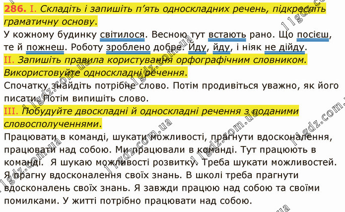 І. Складіть і запишіть п’ять односкладних речень, підкресліть граматичну основу. У кожному будинку світилося. Весною тут встають рано. Що посієш, те й пожнеш. Роботу зроблено добре. Йду, йду, і ніяк не дійду. ІІ. Запишіть правила користування орфографічним словником. Використовуйте односкладні речення. Спочатку знайдіть потрібне слово. Потім продивіться уважно, як його писати. Потім випишіть слово. ІІІ. Побудуйте двоскладні й односкладні речення з поданими словосполученнями. Працювати в команді, шукати можливості, прагнути вдосконалення, працювати над собою. Ми працювали в команді. Тут працюють в команді. Я шукаю можливості розвитку. Треба шукати можливостей. Я прагну вдосконалення своїх знань. В школі треба прагнути вдосконалень своїх знань. Я завжди працюю над собою та своїми помилками. У житті потрібно працювати над собою.