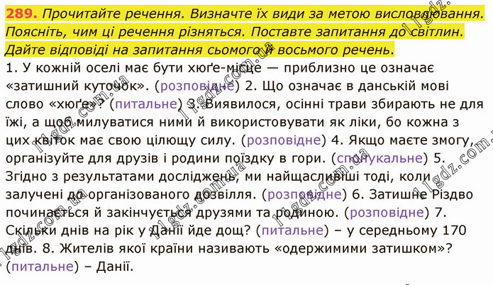 Прочитайте речення. Визначте їх види за метою висловлювання. Поясніть, чим ці речення різняться. Поставте запитання до світлин. Дайте відповіді на запитання сьомого й восьмого речень. 1. У кожній оселі має бути хюґе-місце — приблизно це означає «затишний куточок». (розповідне) 2. Що означає в данській мові слово «хюґе»? (питальне) 3. Виявилося, осінні трави збирають не для їжі, а щоб милуватися ними й використовувати як ліки, бо кожна з цих квіток має свою цілющу силу. (розповідне) 4. Якщо маєте змогу, організуйте для друзів і родини поїздку в гори. (спонукальне) 5. Згідно з результатами досліджень, ми найщасливіші тоді, коли залучені до організованого дозвілля. (розповідне) 6. Затишне Різдво починається й закінчується друзями та родиною. (розповідне) 7. Скільки днів на рік у Данії йде дощ? (питальне) – у середньому 170 днів. 8. Жителів якої країни називають «одержимими затишком»? (питальне) – Данії.