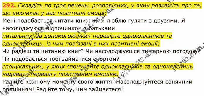 Складіть по троє речень: розповідних, у яких розкажіть про те, що викликає у вас позитивні емоції; Мені подобається читати книжки. Я люблю гуляти з друзями. Я насолоджуюся відпочинком з батьками. питальних, за допомогою яких перевірте однокласників та однокласниць, із чим пов’язані в них позитивні емоції; Чи радієш ти читанню книг? Чи насолоджуєшся ти гарною погодою? Чи подобається тобі займатися спортом? спонукальних, у яких спонукайте однокласників та однокласниць надавати перевагу позитивним емоціям. Радійте кожному моменту свого життя! Насолоджуйтеся сонячним промінням! Радійте тому, чим займаєтеся!