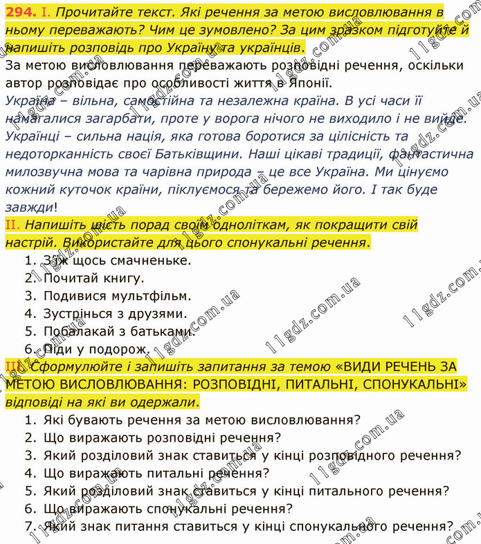 І. Прочитайте текст. Які речення за метою висловлювання в ньому переважають? Чим це зумовлено? За цим зразком підготуйте й напишіть розповідь про Україну та українців. За метою висловлювання переважають розповідні речення, оскільки автор розповідає про особливості життя в Японії. Україна – вільна, самостійна та незалежна країна. В усі часи її намагалися загарбати, проте у ворога нічого не виходило і не вийде. Українці – сильна нація, яка готова боротися за цілісність та недоторканність своєї Батьківщини. Наші цікаві традиції, фантастична милозвучна мова та чарівна природа – це все Україна. Ми цінуємо кожний куточок країни, піклуємося та бережемо його. І так буде завжди! ІІ. Напишіть шість порад своїм одноліткам, як покращити свій настрій. Використайте для цього спонукальні речення. 1. З’їж щось смачненьке. 2. Почитай книгу. 3. Подивися мультфільм. 4. Зустрінься з друзями. 5. Побалакай з батьками. 6. Піди у подорож. ІІІ. Сформулюйте і запишіть запитання за темою «ВИДИ РЕЧЕНЬ ЗА МЕТОЮ ВИСЛОВЛЮВАННЯ: РОЗПОВІДНІ, ПИТАЛЬНІ, СПОНУКАЛЬНІ» відповіді на які ви одержали. 1. Які бувають речення за метою висловлювання? 2. Що виражають розповідні речення? 3. Який розділовий знак ставиться у кінці розповідного речення? 4. Що виражають питальні речення? 5. Який розділовий знак ставиться у кінці питального речення? 6. Що виражають спонукальні речення? 7. Який знак питання ставиться у кінці спонукального речення?