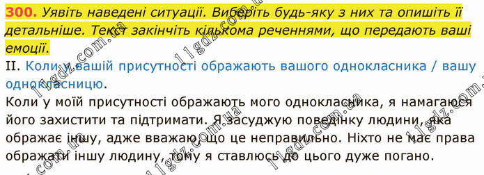 Уявіть наведені ситуації. Виберіть будь-яку з них та опишіть її детальніше. Текст закінчіть кількома реченнями, що передають ваші емоції. ІІ. Коли у вашій присутності ображають вашого однокласника / вашу однокласницю. Коли у моїй присутності ображають мого однокласника, я намагаюся його захистити та підтримати. Я засуджую поведінку людини, яка ображає іншу, адже вважаю, що це неправильно. Ніхто не має права ображати іншу людину, тому я ставлюсь до цього дуже погано.