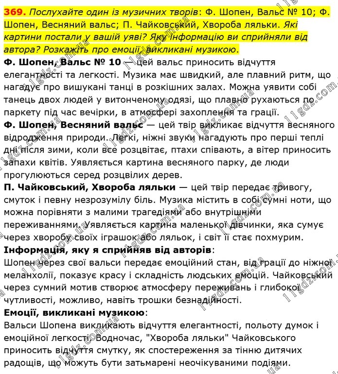 Послухайте один із музичних творів: Ф. Шопен, Вальс № 10; Ф. Шопен, Весняний вальс; П. Чайковський, Хвороба ляльки. Які картини постали у вашій уяві? Яку інформацію ви сприйняли від автора? Розкажіть про емоції, викликані музикою. Ф. Шопен, Вальс № 10 — цей вальс приносить відчуття елегантності та легкості. Музика має швидкий, але плавний ритм, що нагадує про вишукані танці в розкішних залах. Можна уявити собі танець двох людей у витонченому одязі, що плавно рухаються по паркету під час вечірки, в атмосфері захоплення та грації. Ф. Шопен, Весняний вальс — цей твір викликає відчуття весняного відродження природи. Легкі, ніжні звуки нагадують про перші теплі дні після зими, коли все розцвітає, птахи співають, а вітер приносить запахи квітів. Уявляється картина весняного парку, де люди прогулюються серед розцвілих дерев. П. Чайковський, Хвороба ляльки — цей твір передає тривогу, смуток і певну незрозумілу біль. Музика містить в собі сумні ноти, що можна порівняти з малими трагедіями або внутрішніми переживаннями. Уявляється картина маленької дівчинки, яка сумує через хворобу своїх іграшок або ляльок, і світ її стає похмурим. Інформація, яку я сприйняв від авторів: Шопен через свої вальси передає емоційний стан, від грації до ніжної меланхолії, показує красу і складність людських емоцій. Чайковський через сумний мотив створює атмосферу переживань і глибокої чутливості, можливо, навіть трошки безнадійності. Емоції, викликані музикою: Вальси Шопена викликають відчуття елегантності, польоту думок і емоційної легкості. Водночас, "Хвороба ляльки" Чайковського приносить відчуття смутку, як спостереження за тінню дитячих радощів, що можуть бути затьмарені неочікуваними подіями.