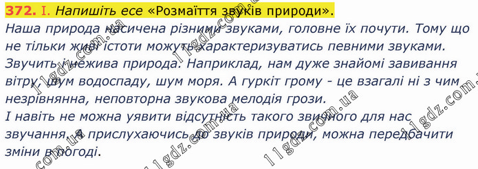 І. Напишіть есе «Розмаїття звуків природи». Наша природа насичена різними звуками, головне їх почути. Тому що не тільки живі істоти можуть характеризуватись певними звуками. Звучить і нежива природа. Наприклад, нам дуже знайомі завивання вітру, шум водоспаду, шум моря. А гуркіт грому - це взагалі ні з чим незрівнянна, неповторна звукова мелодія грози. І навіть не можна уявити відсутність такого звичного для нас звучання. А прислухаючись до звуків природи, можна передбачити зміни в погоді.