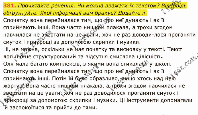 Прочитайте речення. Чи можна вважати їх текстом? Відповідь обґрунтуйте. Якої інформації вам бракує? Додайте її. Спочатку вона переймалася тим, що про неї думають і як її сприймають інші. Вона часто нишком плакала, а трохи згодом навчилася не звертати на це уваги, хоч не раз доводи-лося проганяти смуток і прикрощі за допомогою скрипки і музики. Ні, не можна, оскільки не має початку та висновку у тексті. Текст логічно не структурований та відсутня смислова цілісність. Оля мала багато комплексів, з якими вона стикалася у школі. Спочатку вона переймалася тим, що про неї думають і як її сприймають інші. Потім їй було образливо, якщо хтось над нею жартує. Вона часто нишком плакала, а трохи згодом навчилася не звертати на це уваги, хоч не раз доводилося проганяти смуток і прикрощі за допомогою скрипки і музики. Ці інструменти допомагали їй заспокоїтися та прийти до тями.