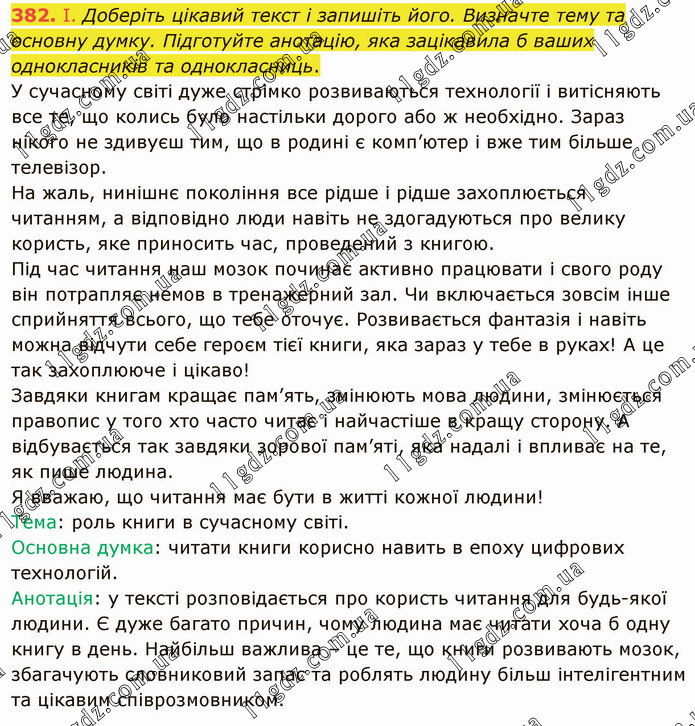 І. Доберіть цікавий текст і запишіть його. Визначте тему та основну думку. Підготуйте анотацію, яка зацікавила б ваших однокласників та однокласниць. У сучасному світі дуже стрімко розвиваються технології і витісняють все те, що колись було настільки дорого або ж необхідно. Зараз нікого не здивуєш тим, що в родині є комп’ютер і вже тим більше телевізор. На жаль, нинішнє покоління все рідше і рідше захоплюється читанням, а відповідно люди навіть не здогадуються про велику користь, яке приносить час, проведений з книгою. Під час читання наш мозок починає активно працювати і свого роду він потрапляє немов в тренажерний зал. Чи включається зовсім інше сприйняття всього, що тебе оточує. Розвивається фантазія і навіть можна відчути себе героєм тієї книги, яка зараз у тебе в руках! А це так захоплююче і цікаво! Завдяки книгам кращає пам’ять, змінюють мова людини, змінюється правопис у того хто часто читає і найчастіше в кращу сторону. А відбувається так завдяки зорової пам’яті, яка надалі і впливає на те, як пише людина. Я вважаю, що читання має бути в житті кожної людини! Тема: роль книги в сучасному світі. Основна думка: читати книги корисно навить в епоху цифрових технологій. Анотація: у тексті розповідається про користь читання для будь-якої людини. Є дуже багато причин, чому людина має читати хоча б одну книгу в день. Найбільш важлива – це те, що книги розвивають мозок, збагачують словниковий запас та роблять людину більш інтелігентним та цікавим співрозмовником.