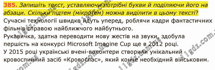 Запишіть текст, уставляючи потрібні букви й поділяючи його на абзаци. Скільки підтем (мікротем) можна виділити в цьому тексті? Сучасні технології швидко йдуть уперед, роблячи кадри фантастичних фільмів справою найближчого майбутнього. Рукавичка, здатна переводити мову жестів на звуки, здобула першість на конкурсі Microsoft Imagine Cup ще в 2012 році. У 2015 році українські вчені-волонтери створили унікальний кровоспинний засіб «Кровоспас», який конче необхідний військовим.