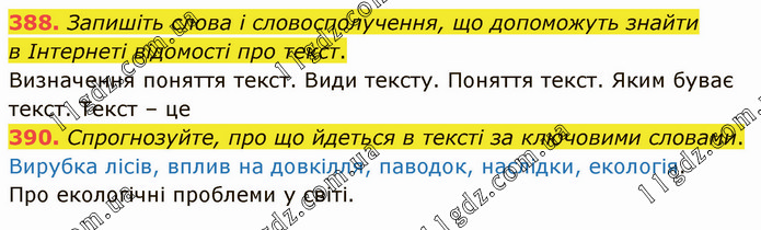 Запишіть слова і словосполучення, що допоможуть знайти в Інтернеті відомості про текст. Визначення поняття текст. Види тексту. Поняття текст. Яким буває текст. Текст – це 390. Спрогнозуйте, про що йдеться в тексті за ключовими словами. Вирубка лісів, вплив на довкілля, паводок, наслідки, екологія. Про екологічні проблеми у світі.