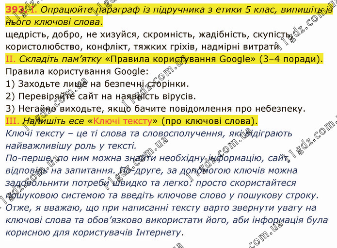 І. Опрацюйте параграф із підручника з етики 5 клас, випишіть із нього ключові слова. щедрість, добро, не хизуйся, скромність, жадібність, скупість, користолюбство, конфлікт, тяжких гріхів, надмірні витрати ІІ. Складіть пам’ятку «Правила користування Google» (3–4 поради). Правила користування Google: 1) Заходьте лише на безпечні сторінки. 2) Перевіряйте сайт на наявність вірусів. 3) Негайно виходьте, якщо бачите повідомлення про небезпеку. ІІІ. Напишіть есе «Ключі тексту» (про ключові слова). Ключі тексту – це ті слова та словосполучення, які відіграють найважливішу роль у тексті. По-перше, по ним можна знайти необхідну інформацію, сайт, відповідь на запитання. По-друге, за допомогою ключів можна задовольнити потреби швидко та легко: просто скористайтеся пошуковою системою та введіть ключове слово у пошукову строку. Отже, я вважаю, що при написанні тексту варто звернути увагу на ключові слова та обов’язково використати його, аби інформація була корисною для користувачів Інтернету.