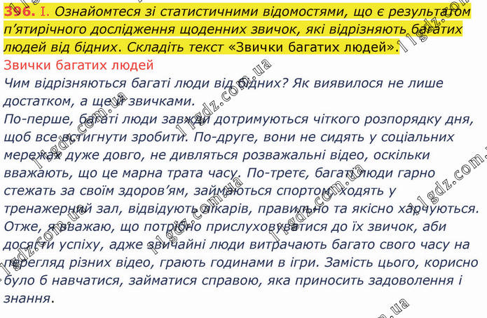 І. Ознайомтеся зі статистичними відомостями, що є результатом п’ятирічного дослідження щоденних звичок, які відрізняють багатих людей від бідних. Складіть текст «Звички багатих людей». Звички багатих людей Чим відрізняються багаті люди від бідних? Як виявилося не лише достатком, а ще й звичками. По-перше, багаті люди завжди дотримуються чіткого розпорядку дня, щоб все встигнути зробити. По-друге, вони не сидять у соціальних мережах дуже довго, не дивляться розважальні відео, оскільки вважають, що це марна трата часу. По-третє, багаті люди гарно стежать за своїм здоров’ям, займаються спортом, ходять у тренажерний зал, відвідують лікарів, правильно та якісно харчуються. Отже, я вважаю, що потрібно прислуховуватися до їх звичок, аби досягти успіху, адже звичайні люди витрачають багато свого часу на перегляд різних відео, грають годинами в ігри. Замість цього, корисно було б навчатися, займатися справою, яка приносить задоволення і знання.