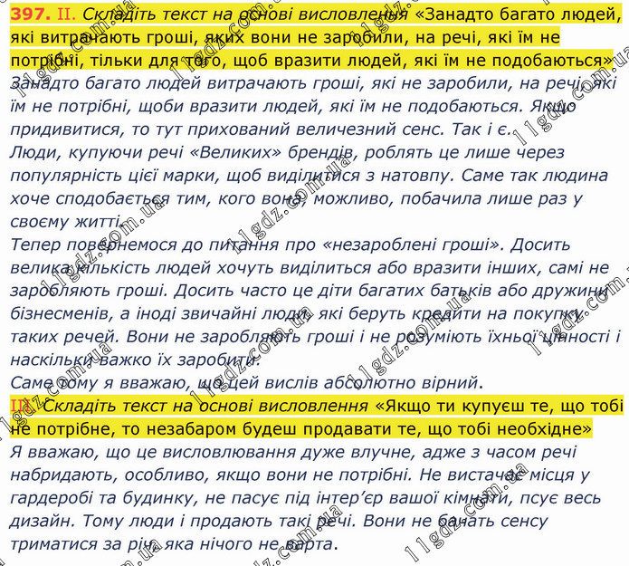 ІІ. Складіть текст на основі висловлення «Занадто багато людей, які витрачають гроші, яких вони не заробили, на речі, які їм не потрібні, тільки для того, щоб вразити людей, які їм не подобаються» Занадто багато людей витрачають гроші, які не заробили, на речі, які їм не потрібні, щоби вразити людей, які їм не подобаються. Якщо придивитися, то тут прихований величезний сенс. Так і є. Люди, купуючи речі «Великих» брендів, роблять це лише через популярність цієї марки, щоб виділитися з натовпу. Саме так людина хоче сподобається тим, кого вона, можливо, побачила лише раз у своєму житті. Тепер повернемося до питання про «незароблені гроші». Досить велика кількість людей хочуть виділиться або вразити інших, самі не заробляють гроші. Досить часто це діти багатих батьків або дружини бізнесменів, а іноді звичайні люди, які беруть кредити на покупку таких речей. Вони не заробляють гроші і не розуміють їхньої цінності і наскільки важко їх заробити. Саме тому я вважаю, що цей вислів абсолютно вірний. ІІІ. Складіть текст на основі висловлення «Якщо ти купуєш те, що тобі не потрібне, то незабаром будеш продавати те, що тобі необхідне» Я вважаю, що це висловлювання дуже влучне, адже з часом речі набридають, особливо, якщо вони не потрібні. Не вистачає місця у гардеробі та будинку, не пасує під інтер’єр вашої кімнати, псує весь дизайн. Тому люди і продають такі речі. Вони не бачать сенсу триматися за річ, яка нічого не варта.