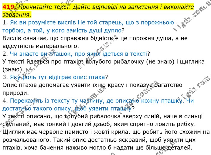 Прочитайте текст. Дайте відповіді на запитання і виконайте завдання. 1. Як ви розумієте вислів Не той старець, що з порожньою торбою, а той, у кого замість душі дупло? Вислів означає, що справжня бідність – це порожня душа, а не відсутність матеріального. 2. Чи знаєте ви пташок, про яких ідеться в тексті? У тексті йдеться про птахів: голубого рибалочку (не знаю) і щиглика (знаю). 3. Яку роль тут відіграє опис птаха? Опис птахів допомагає уявити їхню красу і показує багатство природи. 4. Перекажіть із тексту ту частину, де описано кожну пташку. Чи достатньо такого опису, щоб уявити пташку? У тексті описано, що голубий рибалочка зверху синій, наче в синьці скупаний, має тонкий і довгий дзьоб, яким спритно ловить рибку. Щиглик має червоне намисто і жовті крила, що робить його схожим на розмальованого. Такий опис достатньо яскравий, щоб уявити цих птахів, хоча бачення наживо могло б надати ще більше деталей.