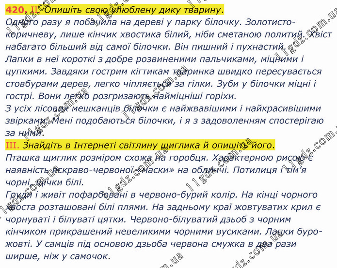 ІІ. Опишіть свою улюблену дику тварину. Одного разу я побачила на дереві у парку білочку. Золотисто-коричневу, лише кінчик хвостика білий, ніби сметаною политий. Хвіст набагато більший від самої білочки. Він пишний і пухнастий. Лапки в неї короткі з добре розвиненими пальчиками, міцними і цупкими. Завдяки гострим кігтикам тваринка швидко пересувається стовбурами дерев, легко чіпляється за гілки. Зуби у білочки міцні і гострі. Вони легко розгризають найміцніші горіхи. З усіх лісових мешканців білочки є найжвавішими і найкрасивішими звірками. Мені подобаються білочки, і я з задоволенням спостерігаю за ними. ІІІ. Знайдіть в Інтернеті світлину щиглика й опишіть його. Пташка щиглик розміром схожа на горобця. Характерною рисою є наявність яскраво-червоної «маски» на обличчі. Потилиця і тім’я чорні, щічки білі. Груди і живіт пофарбовані в червоно-бурий колір. На кінці чорного хвоста розташовані білі плями. На задньому краї жовтуватих крил є чорнуваті і білуваті цятки. Червоно-білуватий дзьоб з чорним кінчиком прикрашений невеликими чорними вусиками. Лапки буро-жовті. У самців під основою дзьоба червона смужка в два рази ширше, ніж у самочок.