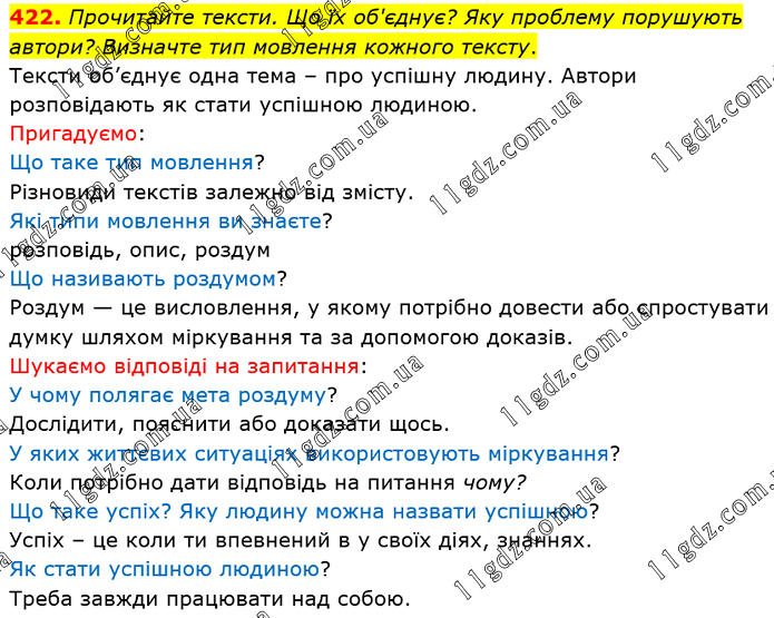 Прочитайте тексти. Що їх об'єднує? Яку проблему порушують автори? Визначте тип мовлення кожного тексту. Тексти об’єднує одна тема – про успішну людину. Автори розповідають як стати успішною людиною. Пригадуємо: Що таке тип мовлення? Різновиди текстів залежно від змісту. Які типи мовлення ви знаєте? розповідь, опис, роздум Що називають роздумом? Роздум — це висловлення, у якому потрібно довести або спростувати думку шляхом міркування та за допомогою доказів. Шукаємо відповіді на запитання: У чому полягає мета роздуму? Дослідити, пояснити або доказати щось. У яких життєвих ситуаціях використовують міркування? Коли потрібно дати відповідь на питання чому? Що таке успіх? Яку людину можна назвати успішною? Успіх – це коли ти впевнений в у своїх діях, знаннях. Як стати успішною людиною? Треба завжди працювати над собою.