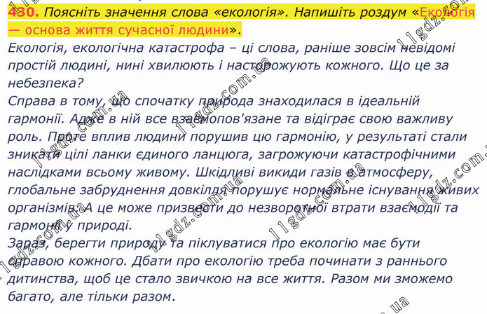 Поясніть значення слова «екологія». Напишіть роздум «Екологія — основа життя сучасної людини». Екологія, екологічна катастрофа – ці слова, раніше зовсім невідомі простій людині, нині хвилюють і насторожують кожного. Що це за небезпека? Справа в тому, що спочатку природа знаходилася в ідеальній гармонії. Адже в ній все взаємопов'язане та відіграє свою важливу роль. Проте вплив людини порушив цю гармонію, у результаті стали зникати цілі ланки єдиного ланцюга, загрожуючи катастрофічними наслідками всьому живому. Шкідливі викиди газів в атмосферу, глобальне забруднення довкілля порушує нормальне існування живих організмів. А це може призвести до незворотної втрати взаємодії та гармонії у природі. Зараз, берегти природу та піклуватися про екологію має бути справою кожного. Дбати про екологію треба починати з раннього дитинства, щоб це стало звичкою на все життя. Разом ми зможемо багато, але тільки разом.